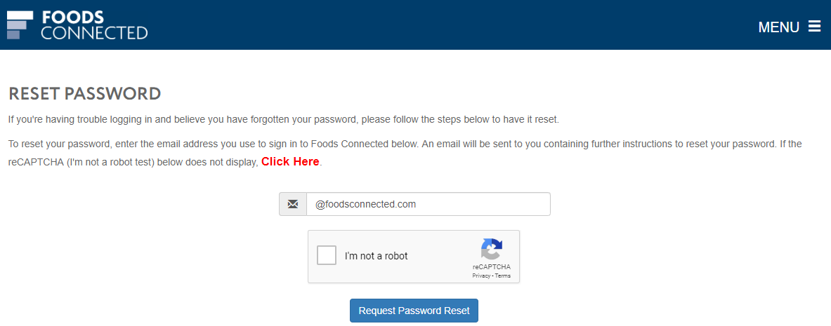 2. Enter your Foods Connected email address > Request Password Reset > Automatic email is sent.